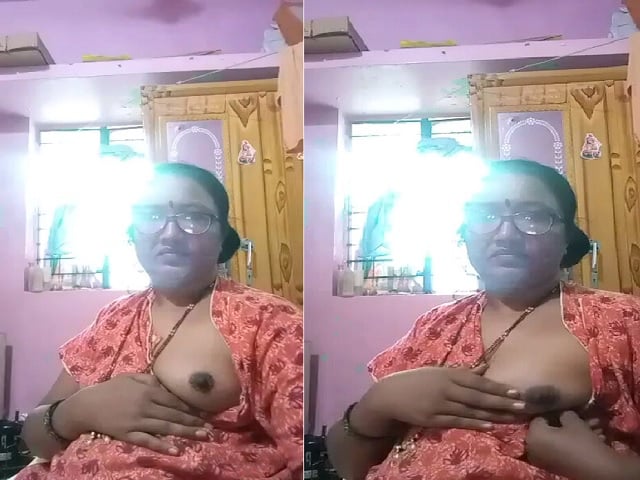 Indian mature aunty showing boobs to lover upon cheating her husband has been caught on cam. A mature aunty in her glasses has shown her naked boob after pulling it out from her nighty. Do you want her to breastfeed you? I certainly want to suck those sexy boobs!